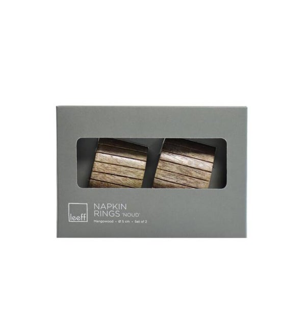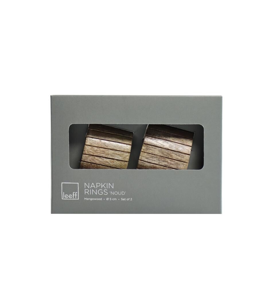De servetringen zijn gemaakt van mangohout en hebben een lijnenpatroon op de bovenkant.
