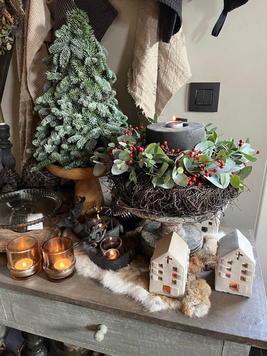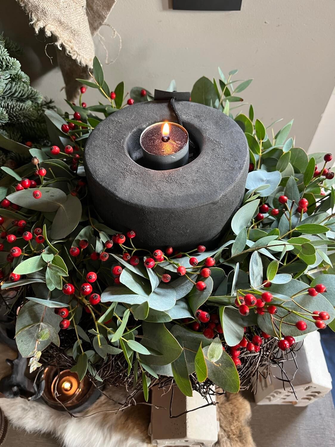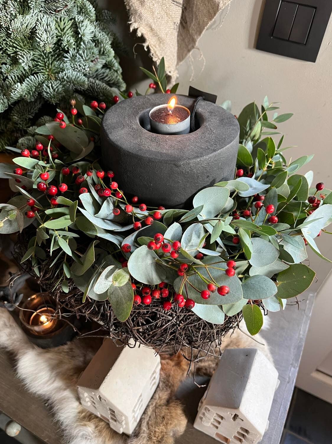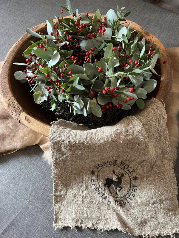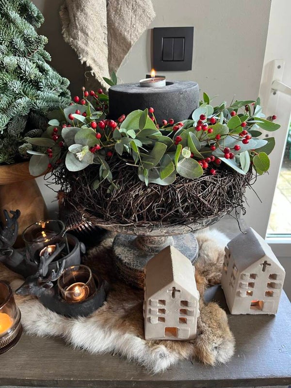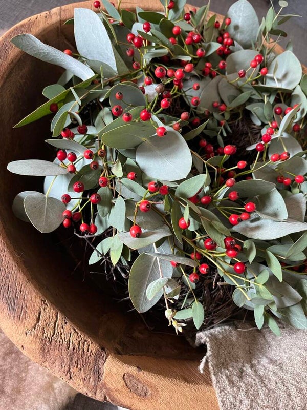 Mooie krans gemaakt op een huisgemaakte salim (Muehlembeckia) krans, afgewerkt met 2 soorten eucalyptus en rozebotteltjes.