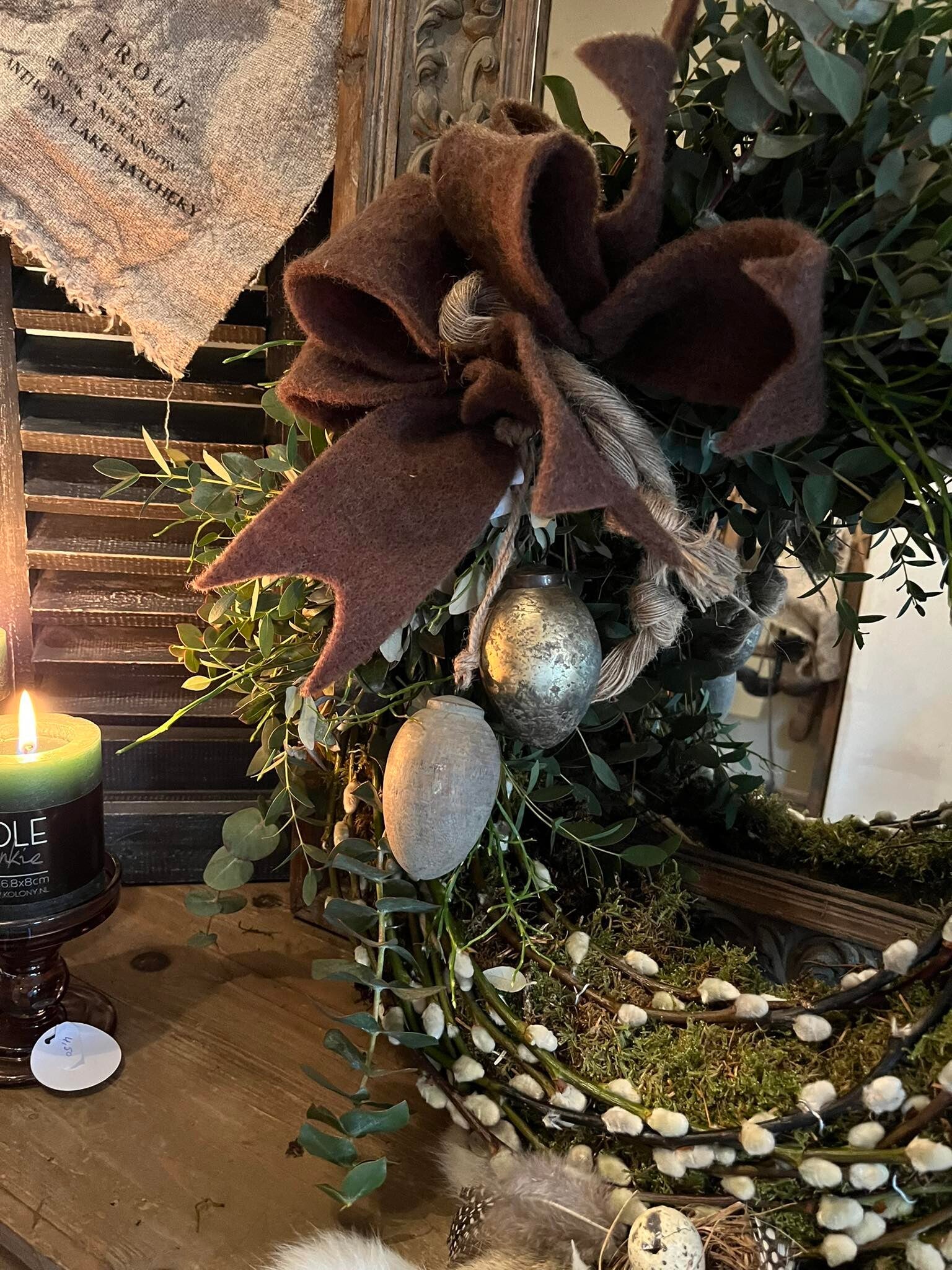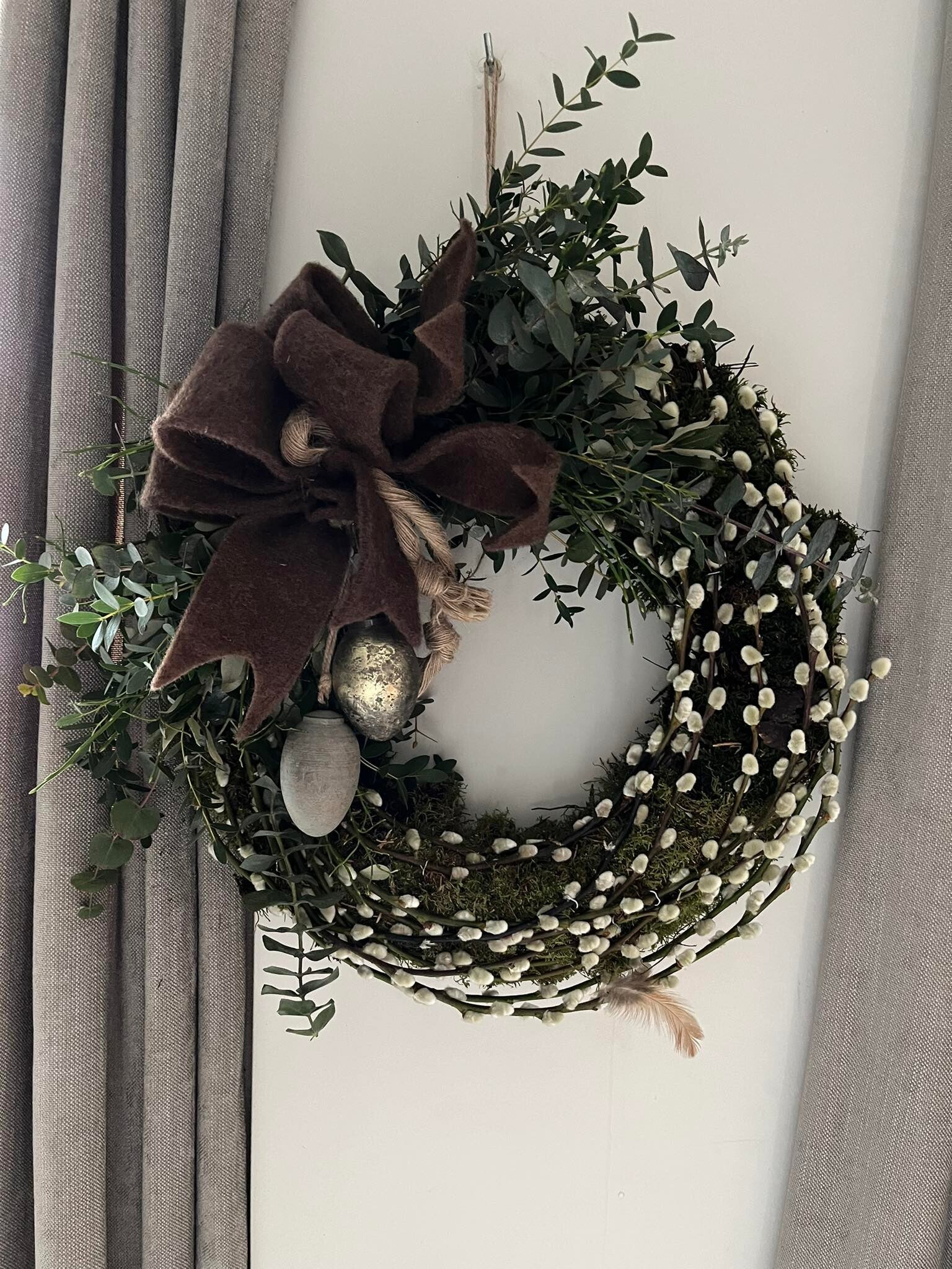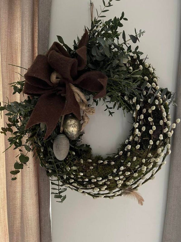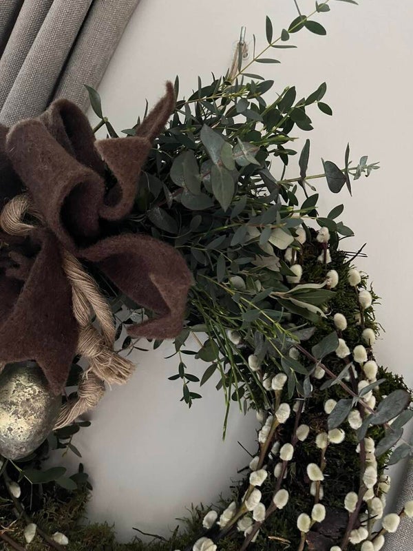 Mooie krans met verschillende eucalyptus soorten, wilgekatjes, mooie strik, ....