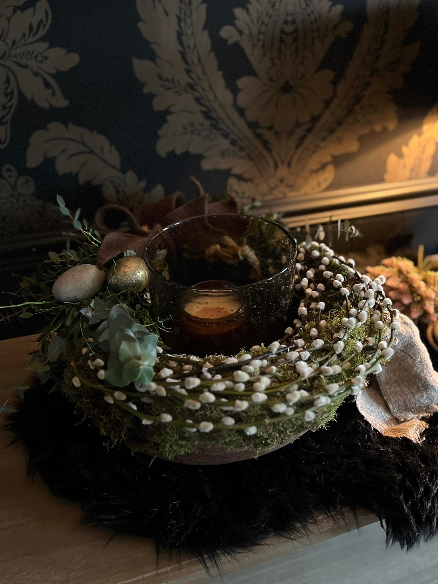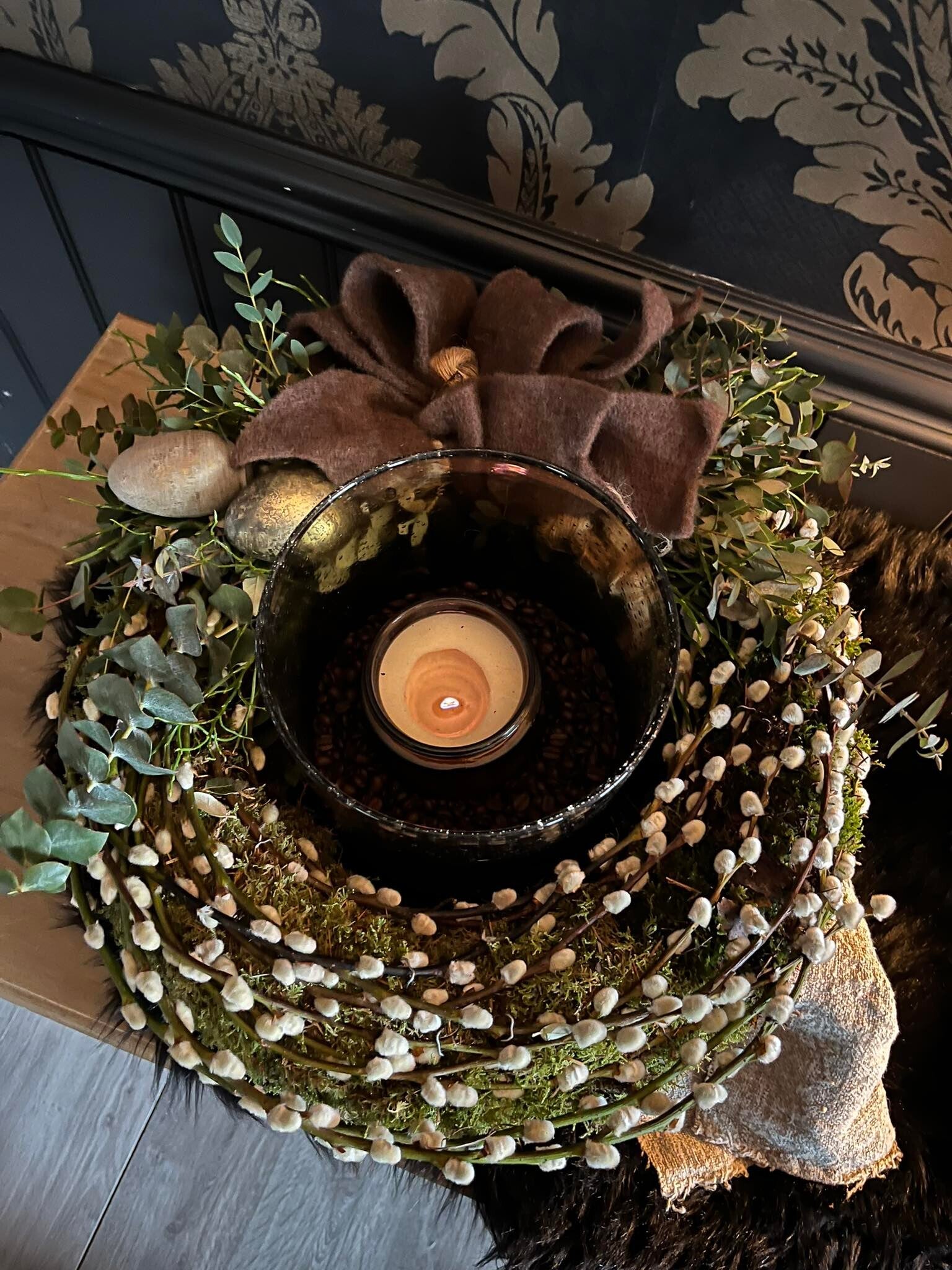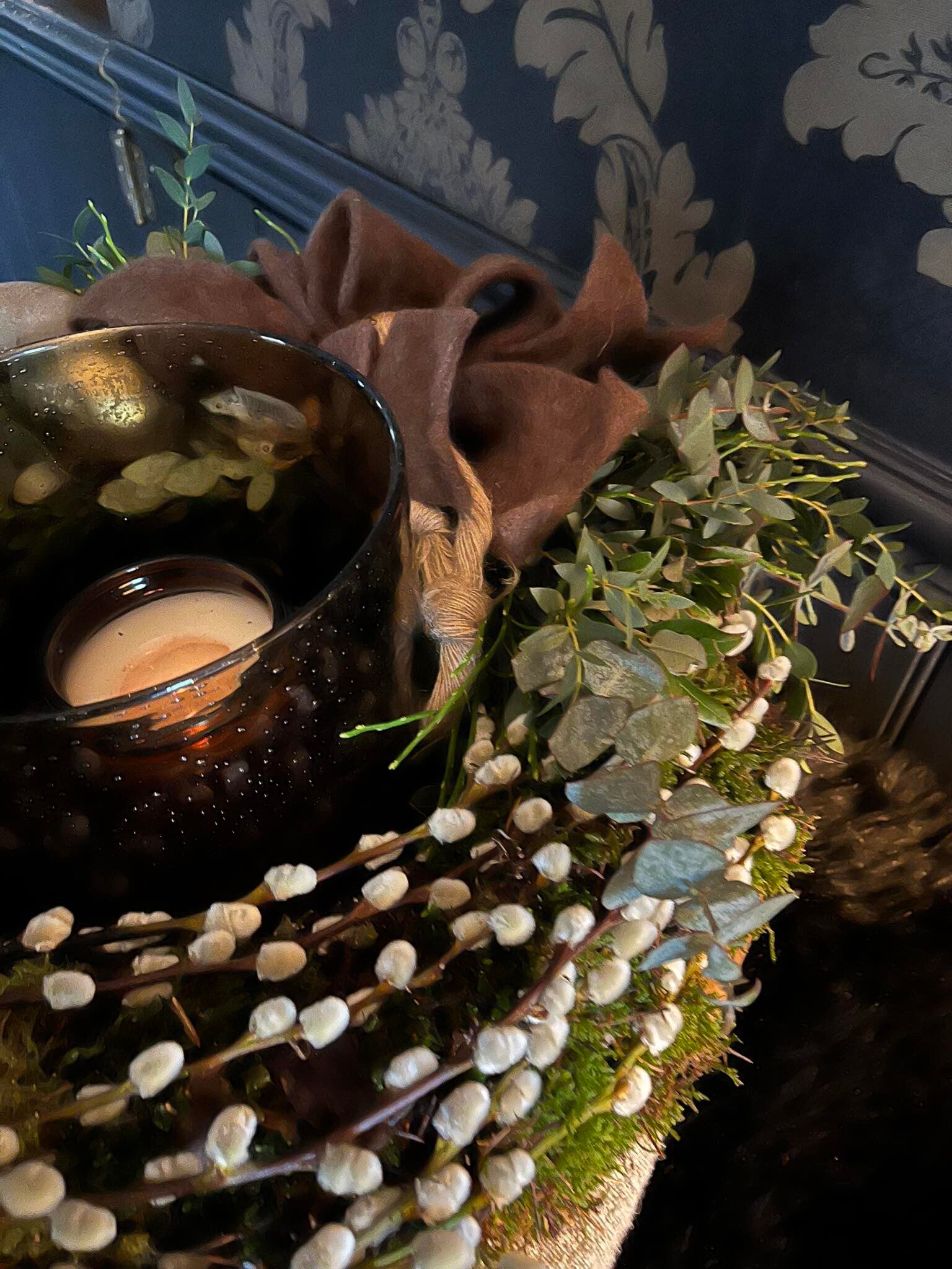 Mooie krans met verschillende eucalyptus soorten, wilgekatjes, mooie strik, ....