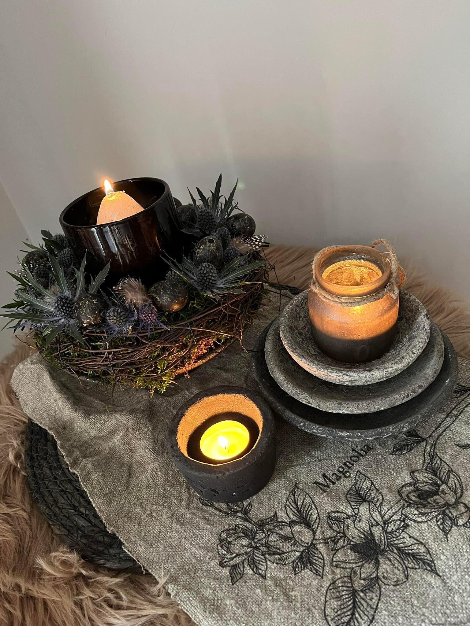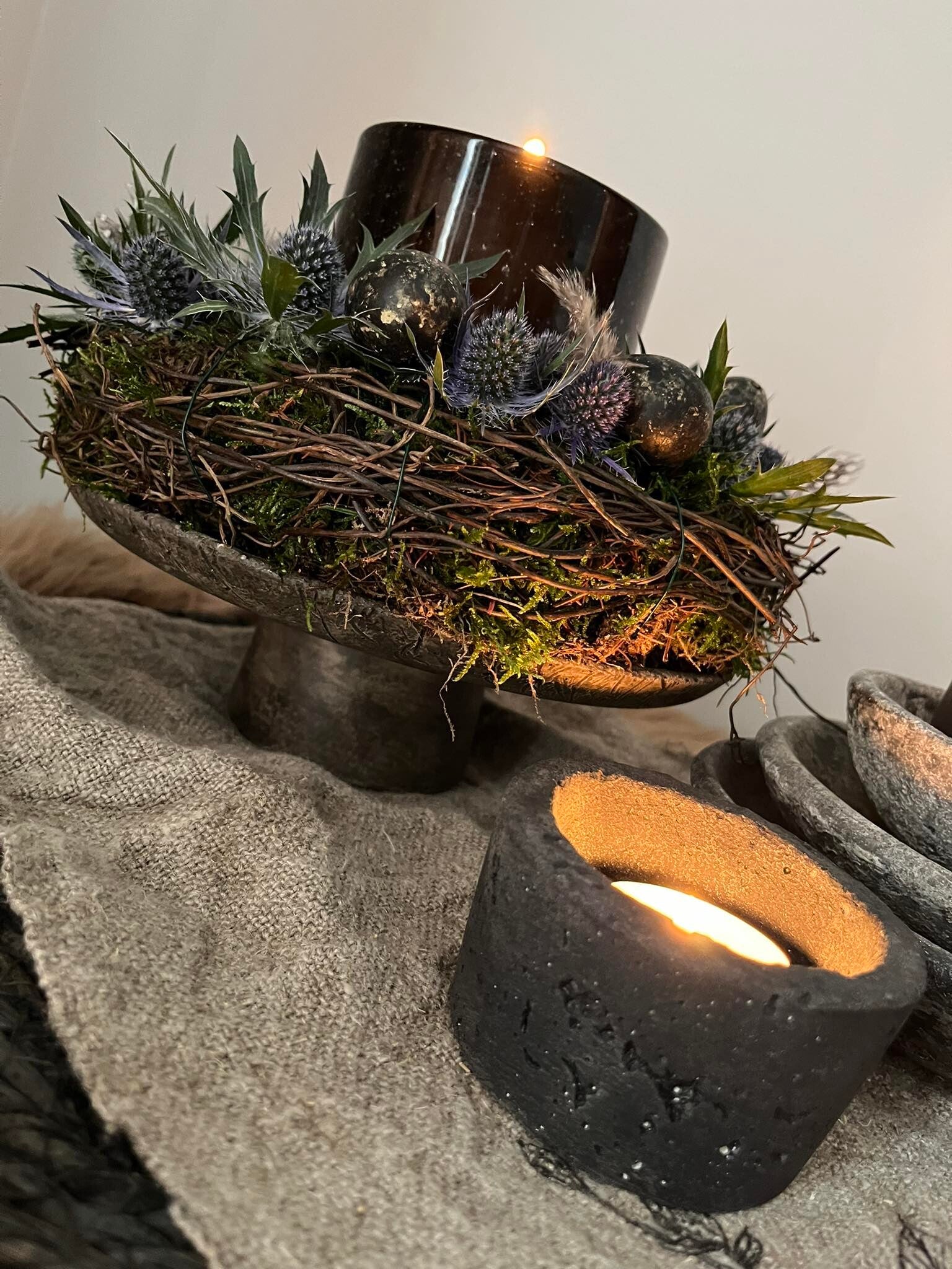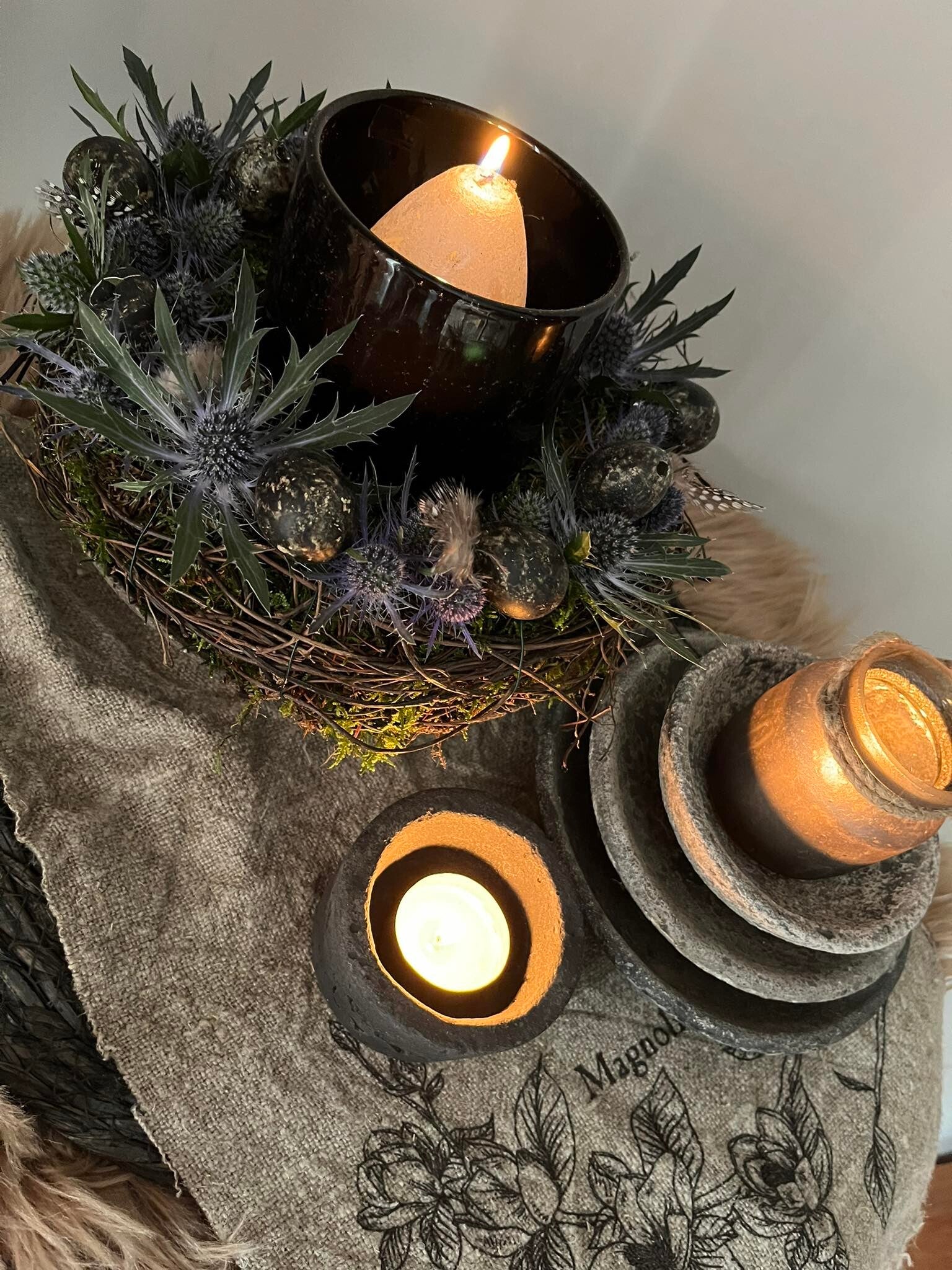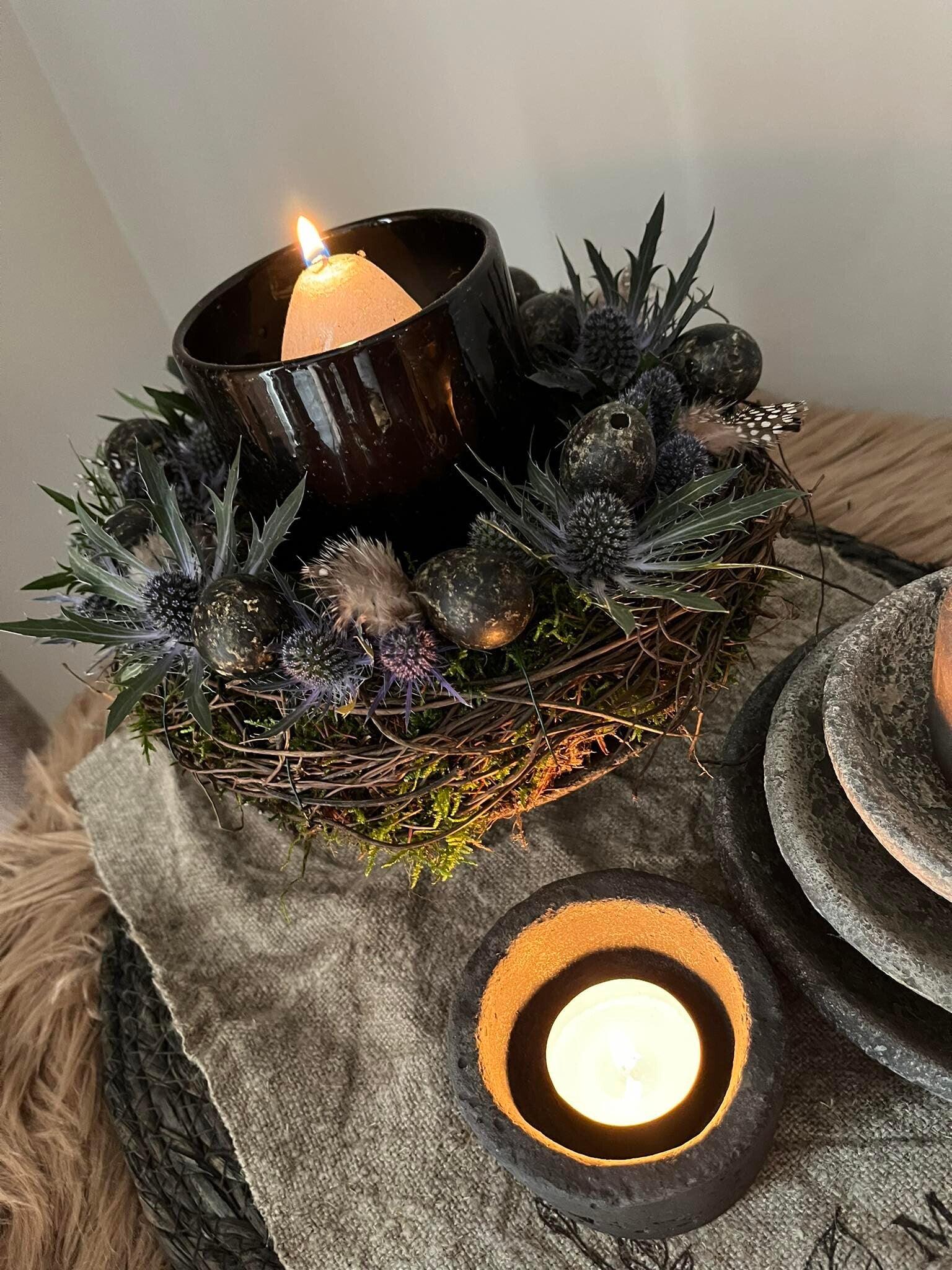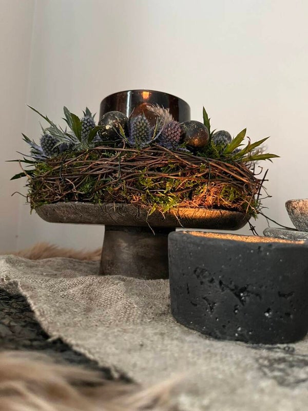 Mooie krans met blauwe disteltjes en kwarteleitjes.