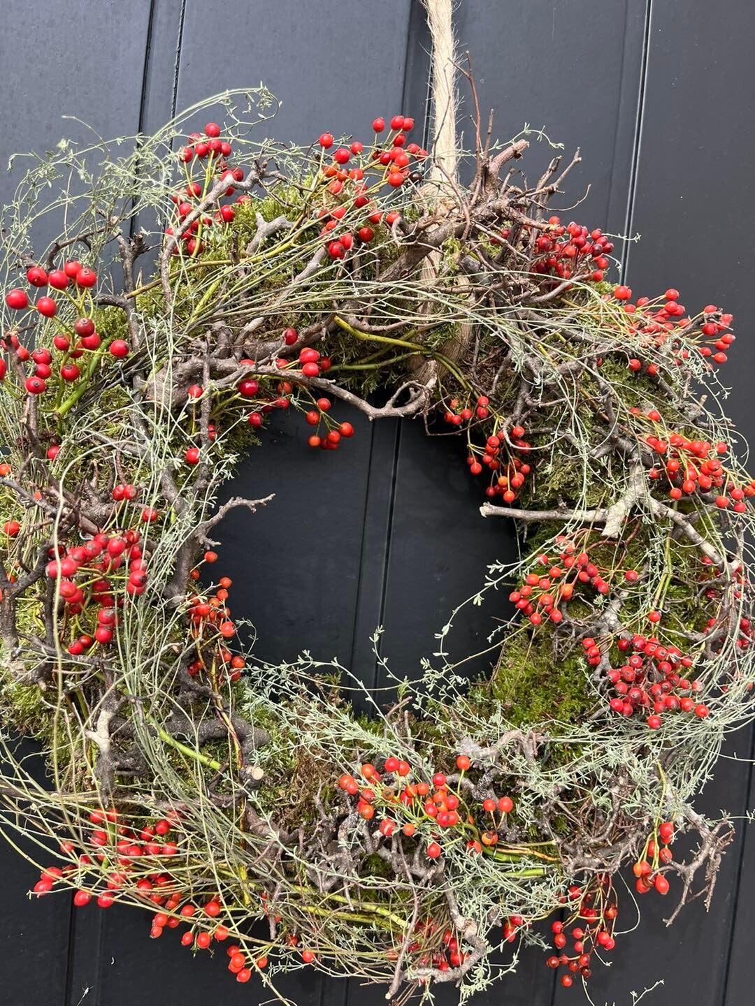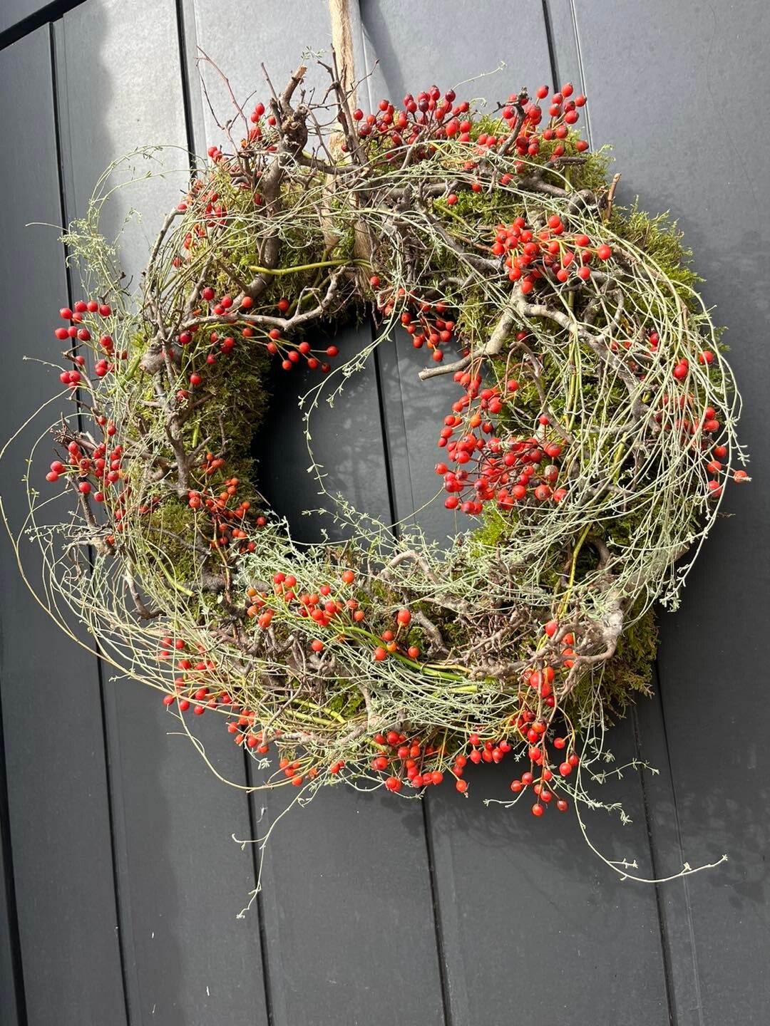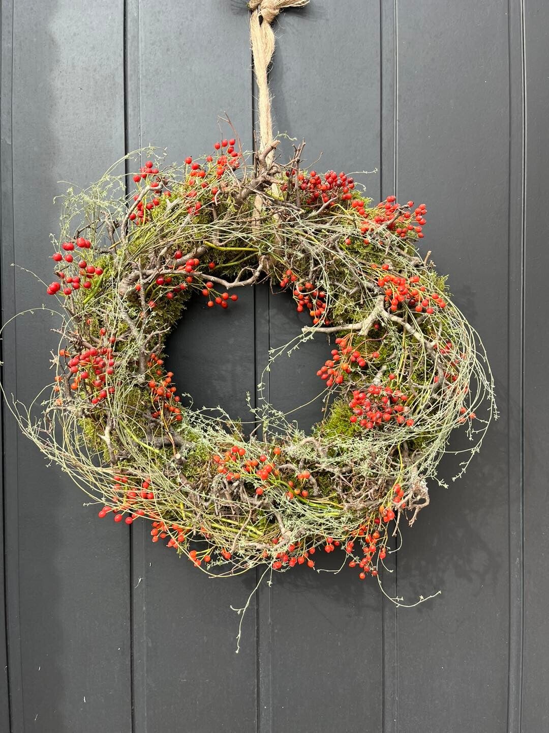 Mooie krans met mos - bonsai - wilde tijm - rode rozebottels en mooi touw.