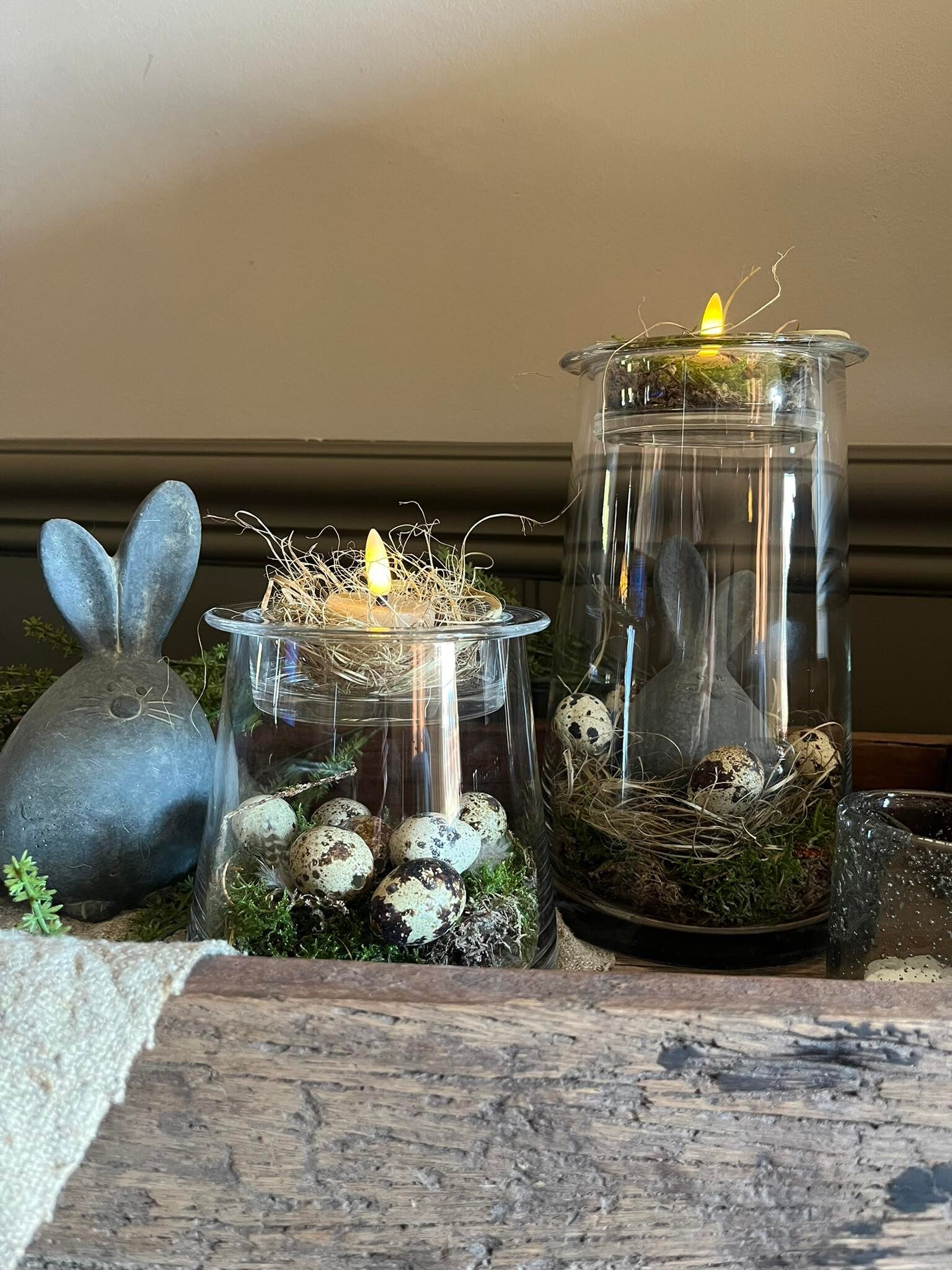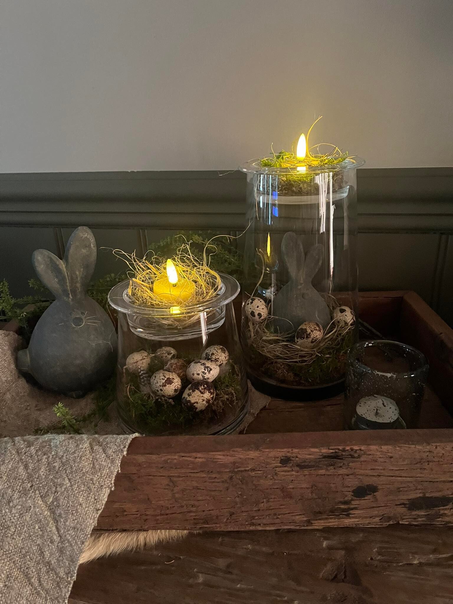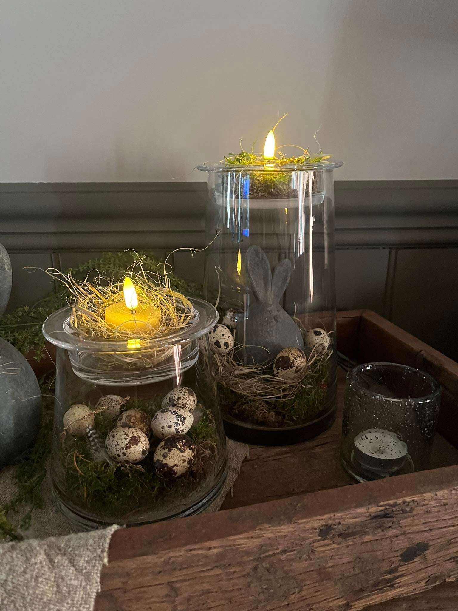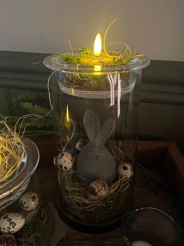 Mooie glazen theelichthouder. Pas de inhoud aan naargelang de seizoenen.