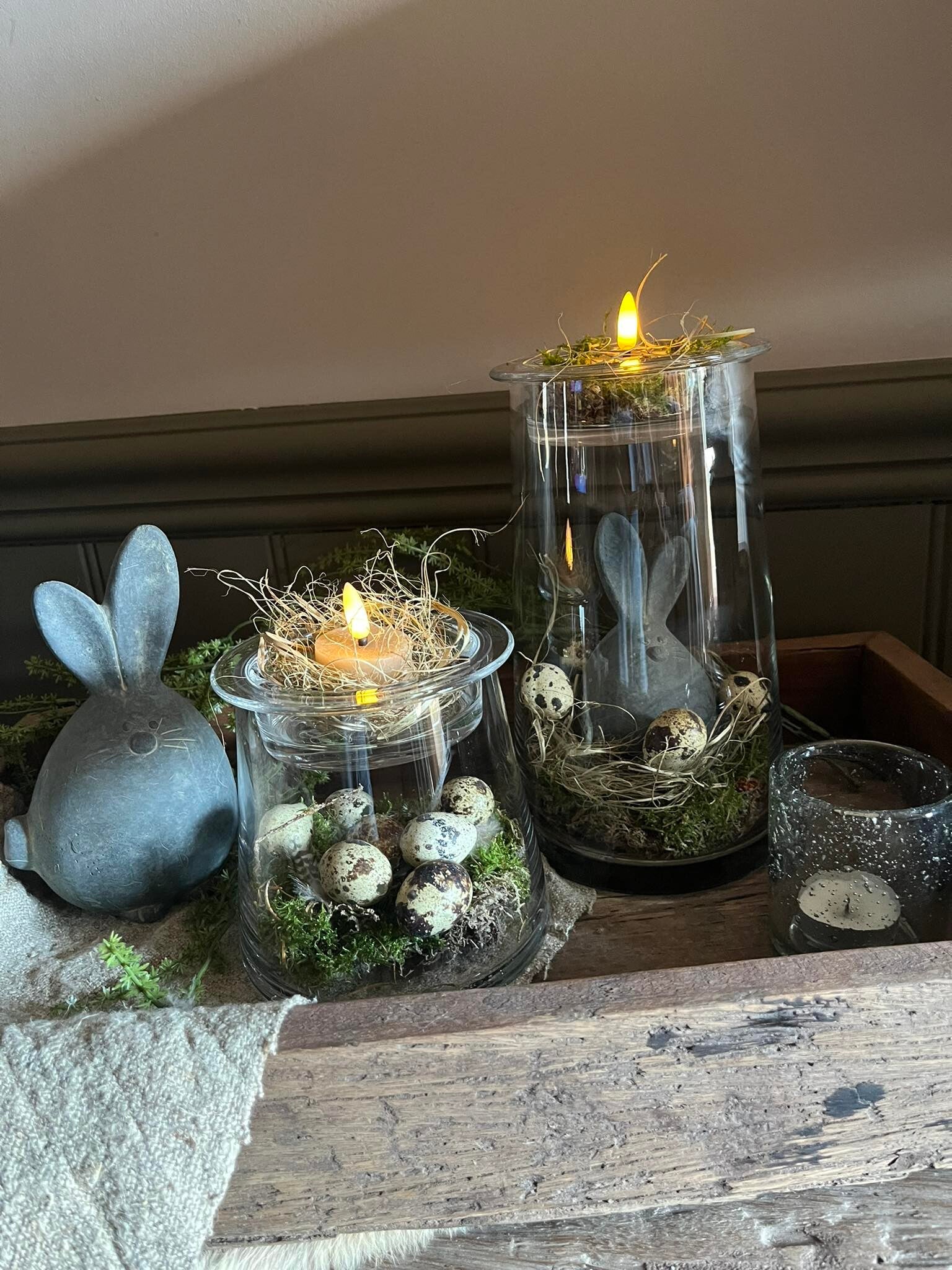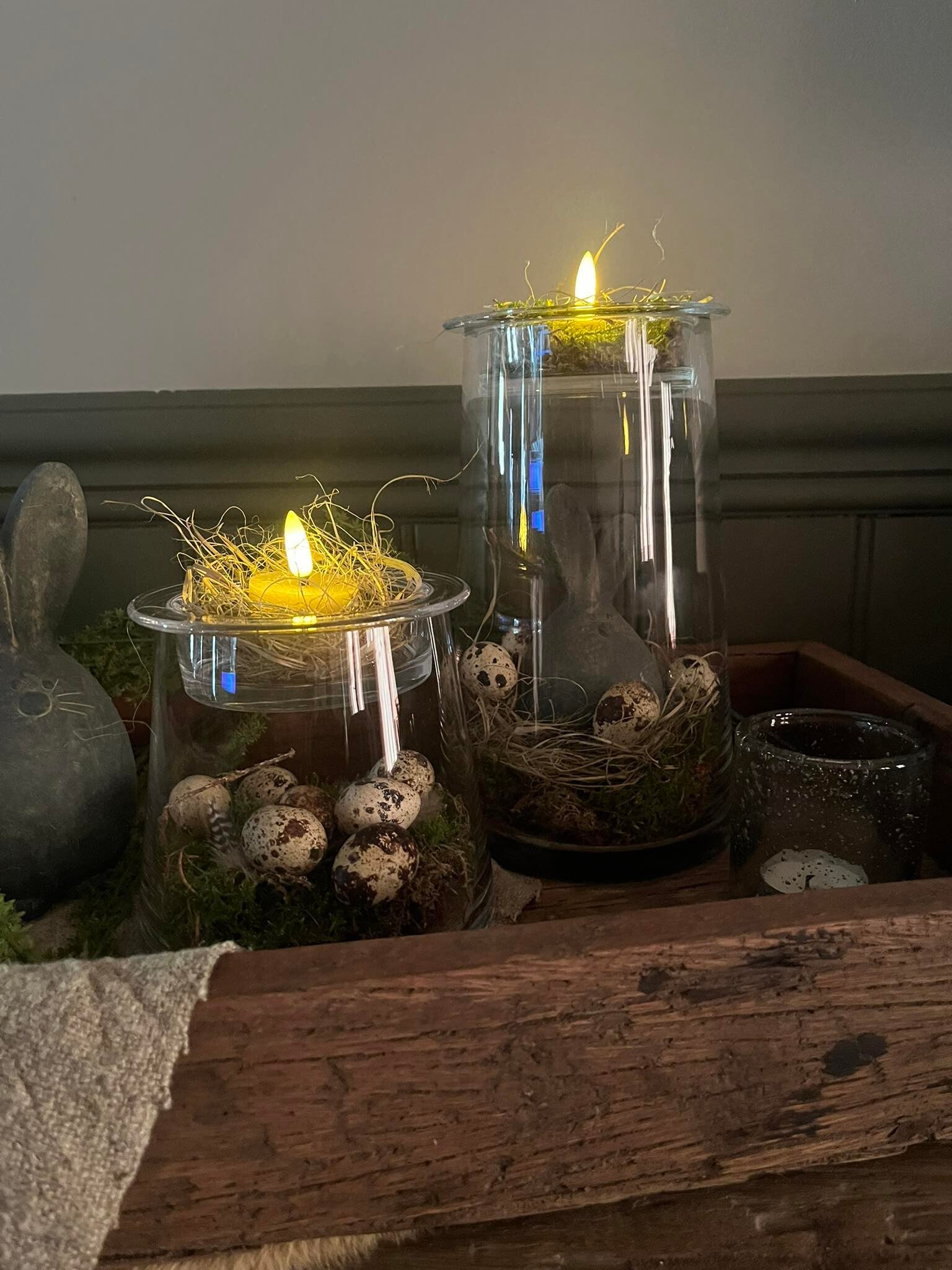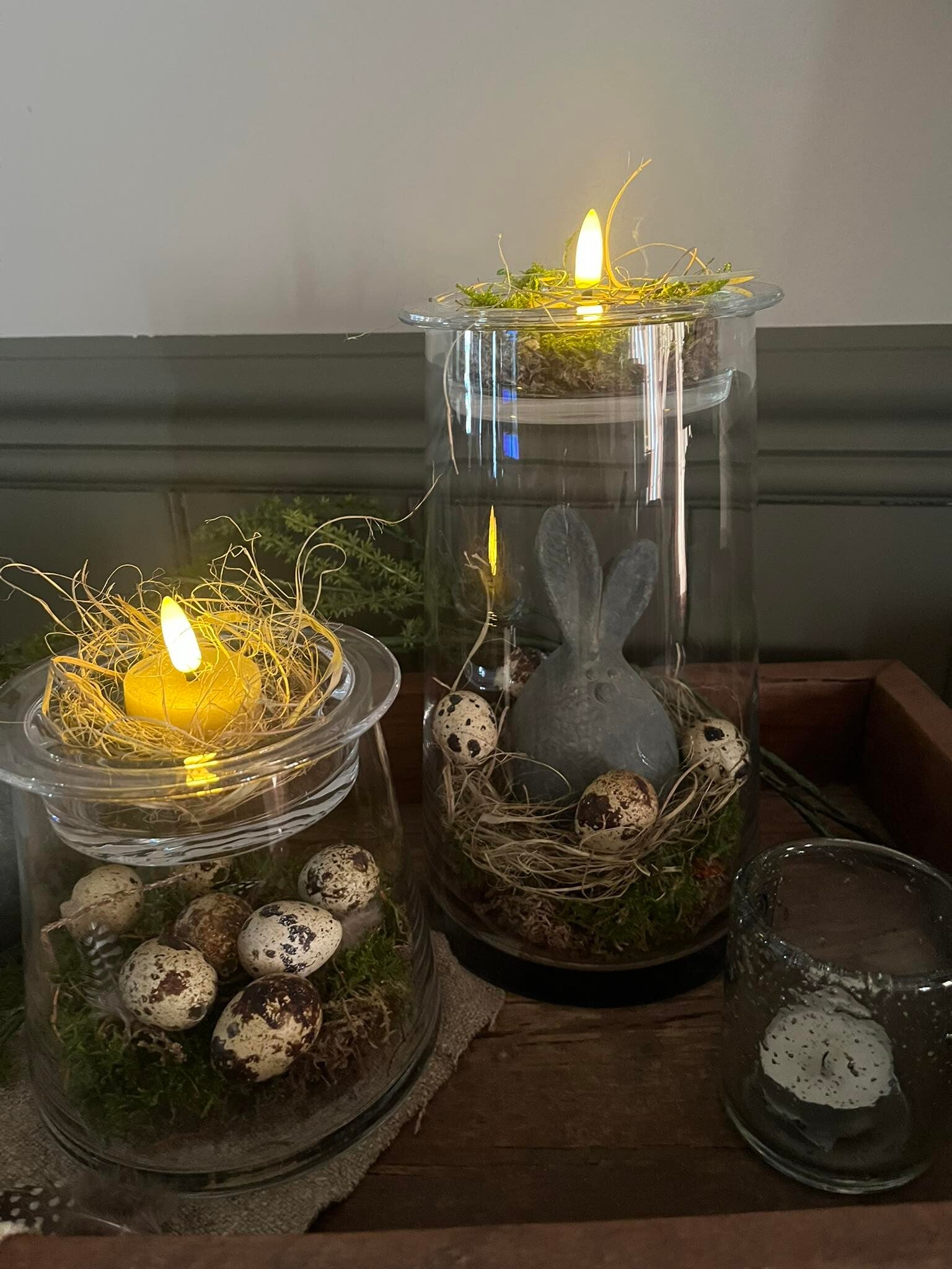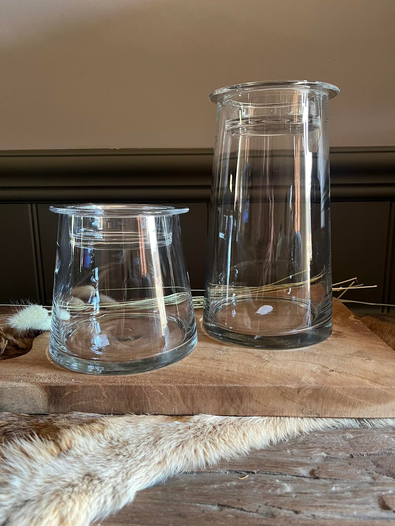 Mooie glazen theelichthouder. Pas de inhoud aan naargelang de seizoenen.
