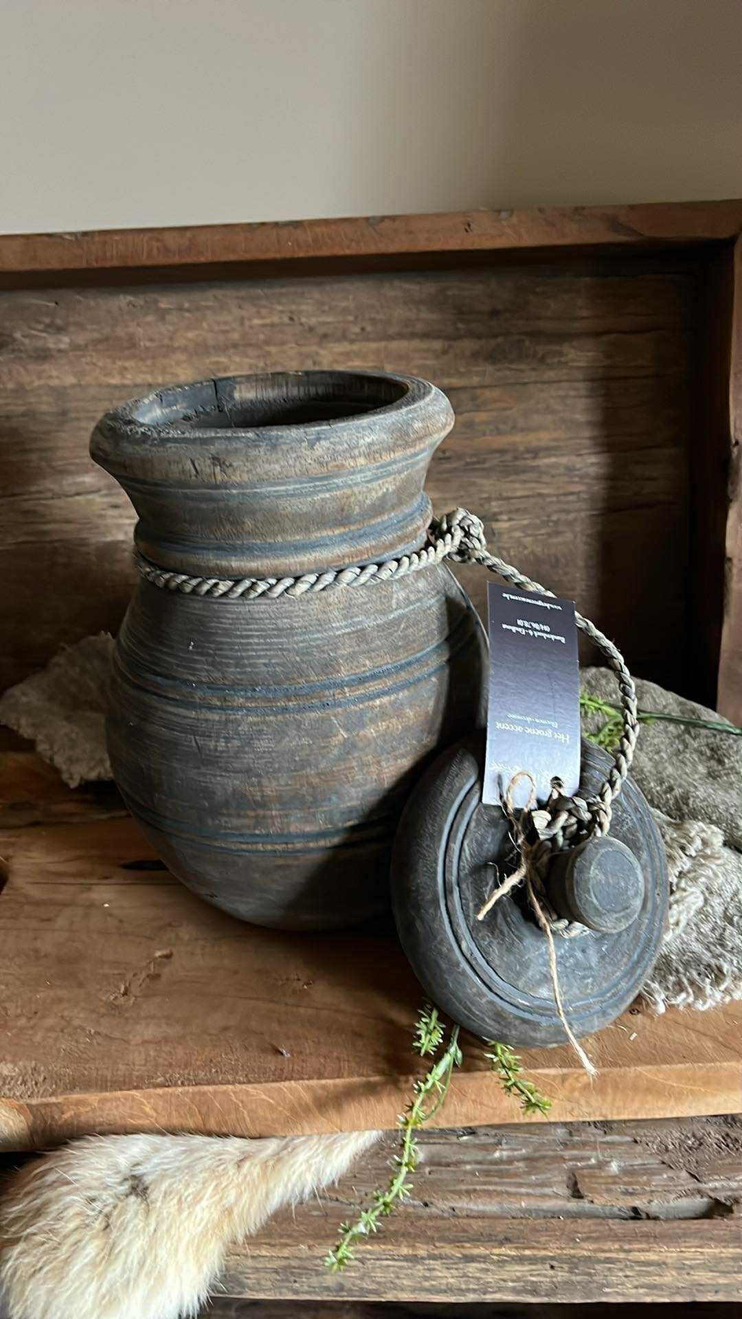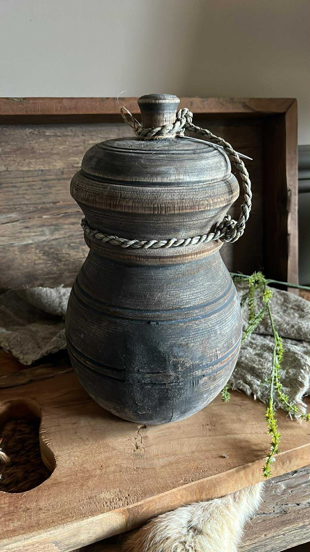 Mooie vergrijzde houten pot met deksel.