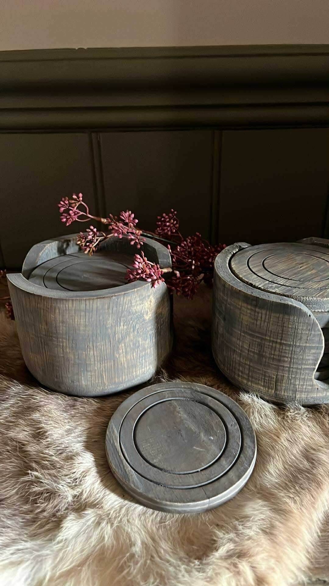 6 houten onderzetters in houten houder.