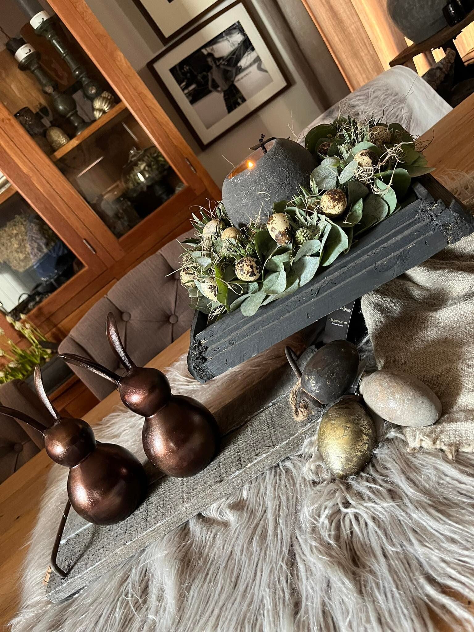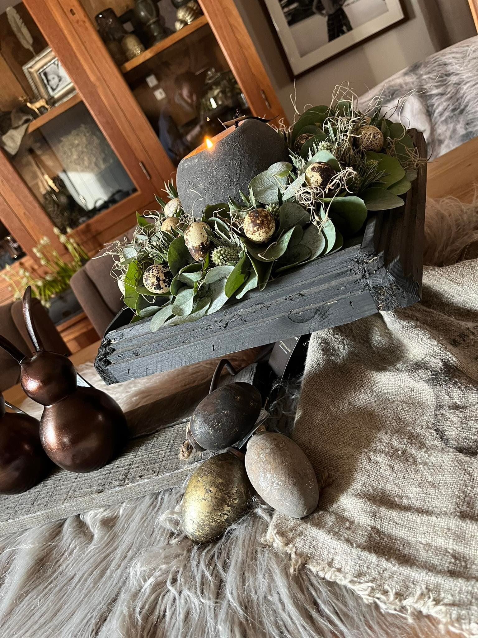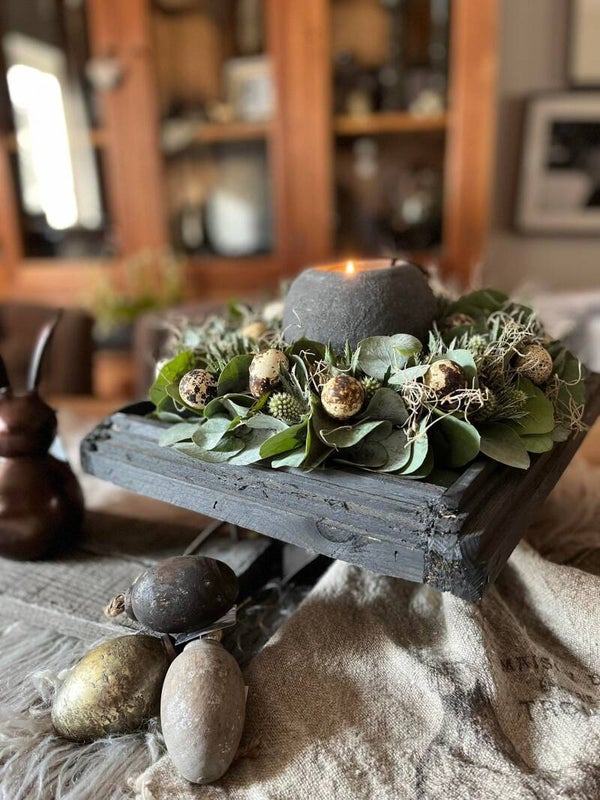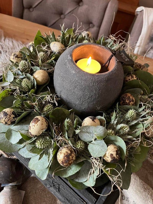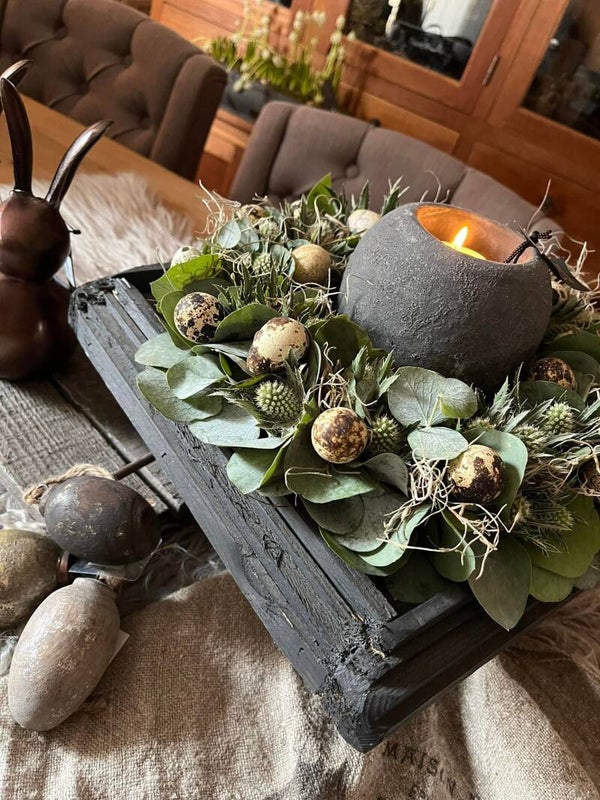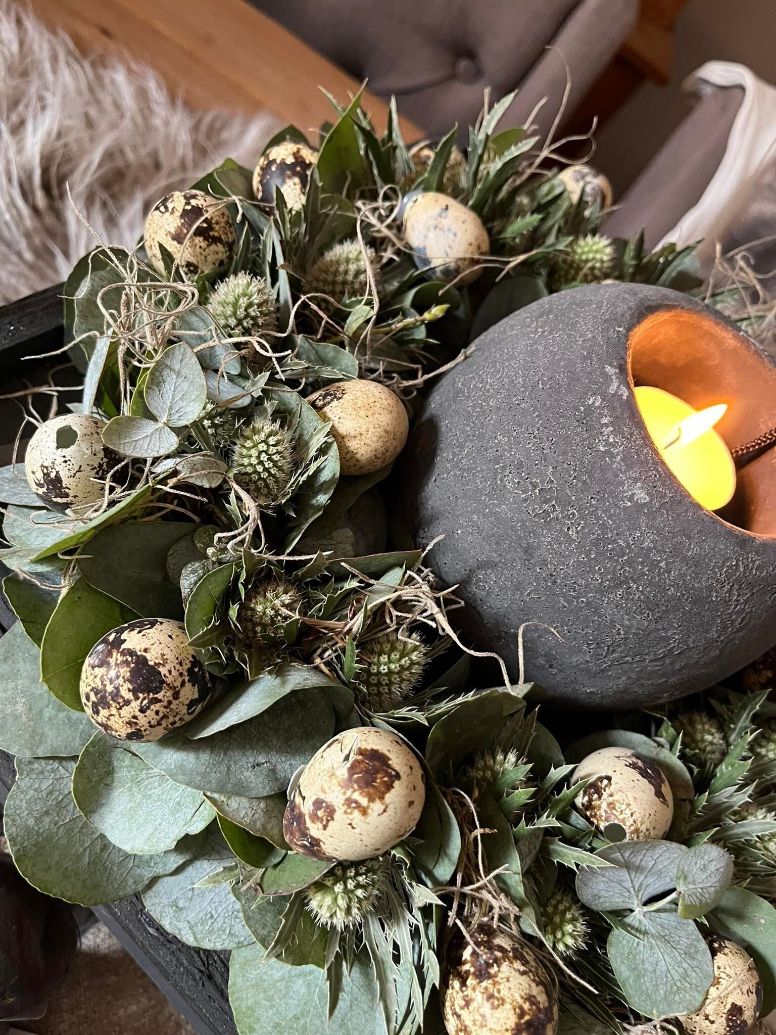 Mooie krans met eucalyptus, witte disteltjes en kwarteleitjes.